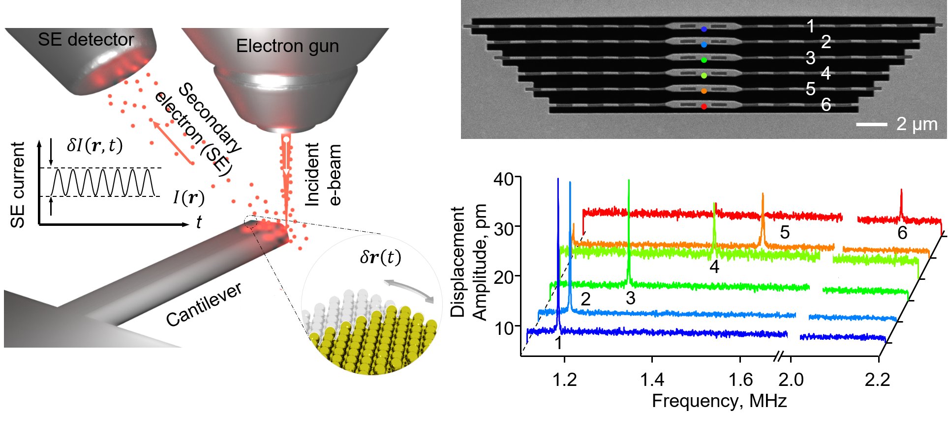 Nanoscale objects move fast and oscillate billions of times per second. Such movements occur naturally in the form of thermal (Brownian) motion while stimulated movements underpin the functionality of nano-mechanical sensors and active nano-(electro/opto) mechanical devices. Here we introduce a methodology for detecting such movements, based on the spectral analysis of secondary electron emission from moving nanostructures, that is sensitive to displacements of sub-atomic amplitude. We demonstrate the detection of nanowire Brownian oscillations of ~10 pm amplitude and hyperspectral mapping of stimulated oscillations of setae on the body of a common flea. The technique opens a range of opportunities for the study of dynamic processes in materials science, nanotechnology and biology.